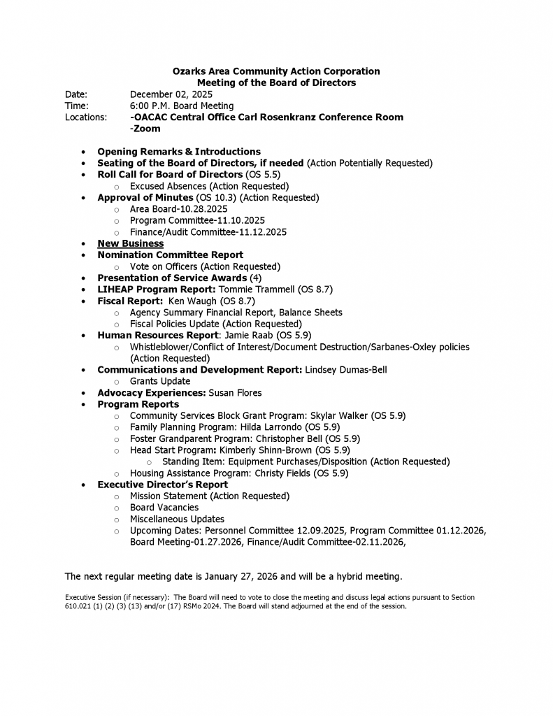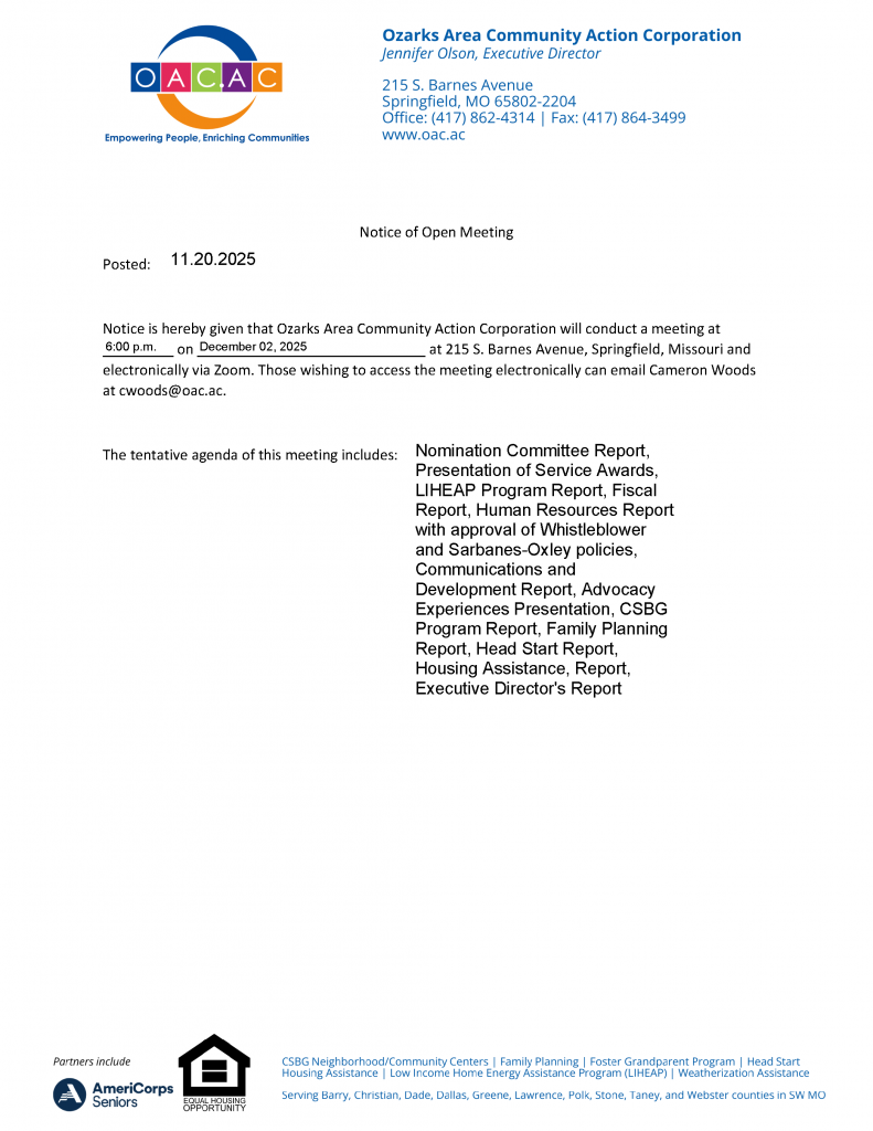 The OACAC Area Board will meet at 6pm on December 2, 2025 at the OACAC Central Office and over Zoom.