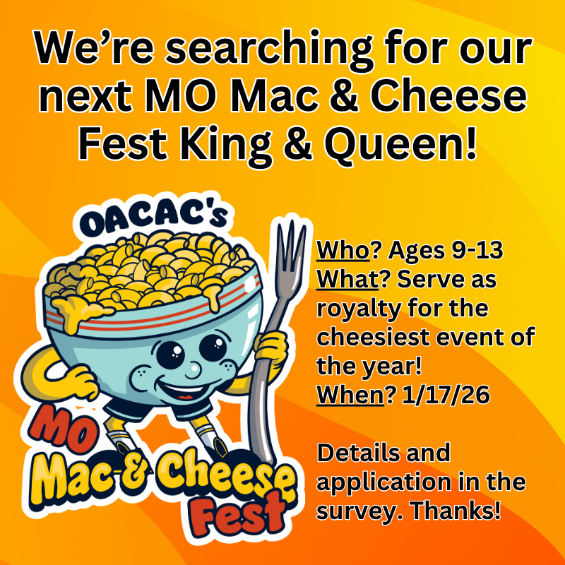 We’re searching for OACAC’s 6th Annual MO Mac & Cheese Fest King & Queen! Do you know a young person, 9-13, who loves mac & cheese and would have fun being cheesy royalty? Please complete this survey and tell us all about them! Deadline to enter is November 3.