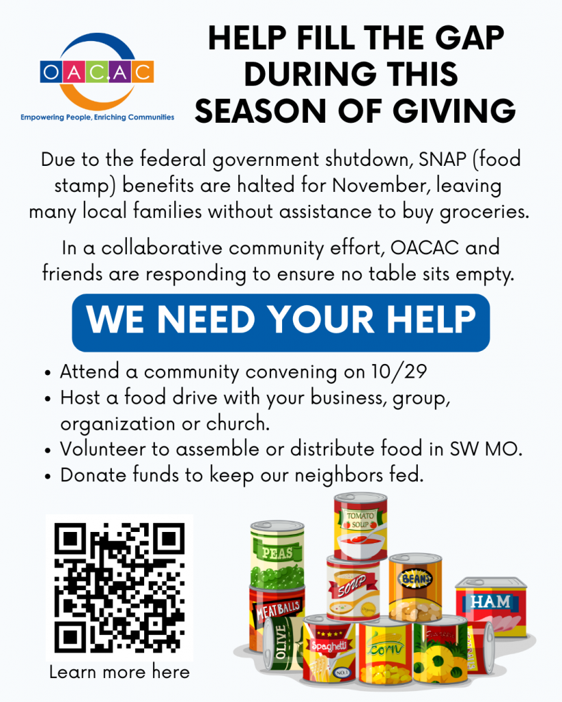 At Ozarks Area Community Action Corporation (OACAC), we know that no single organization can meet this challenge alone. To ensure that people in Southwest Missouri continue to have access to food and essential resources, we taking action in two focused ways: